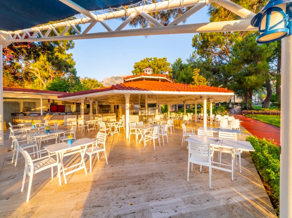 Утренний завтрак, обед и ужин сервируются в формате «шведский стол», и в рамках брендов, определённых отелем, местные алкогольные и безалкогольные напитки предоставляются бесплатно 24 часа. Все напитки в бутылках, свежевыжатый апельсиновый сок (во время завтрака и позднего завтрака), а также торт ко дню рождения платные. Горячие напитки и турецкий кофе бесплатны. В основном ресторане есть детское меню. Напитки, включённые в концепцию, подаются в определённых барах. Все напитки в бутылках платные.